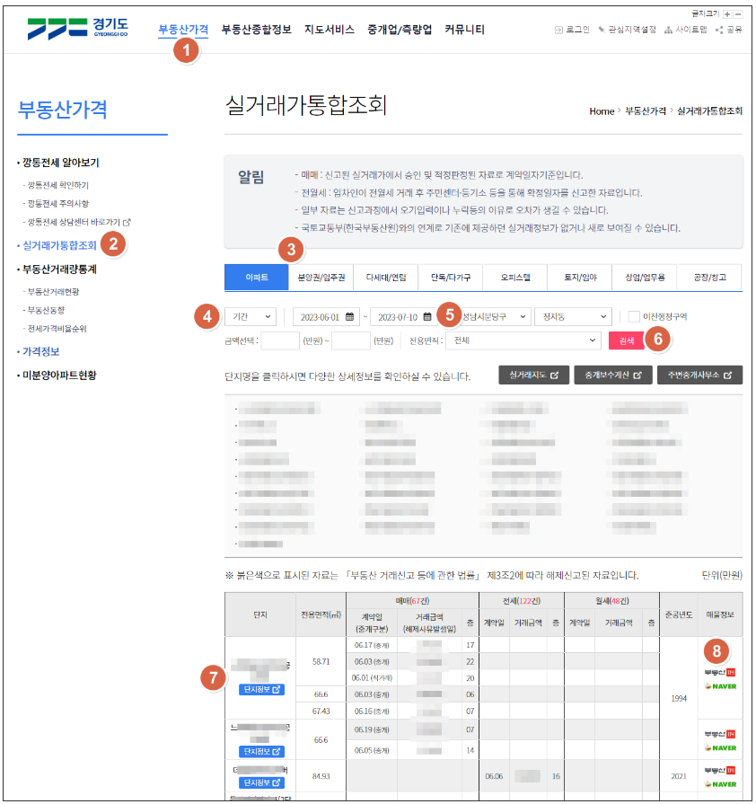 * 경기부동산포털 – 부동산가격 – 실거래가통합조회에서 기간별 금액/전용면적 등 조회조건 입력