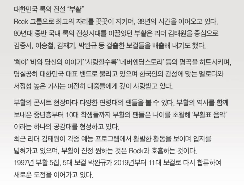 대한민국 록의 전설 부활콘서트가 서울연세대학교 신촌캠퍼스에서 10/28(토) 열린다고 합니다. 80년대 중반 록의 전성기를 이끌어던 부활은 리더 김태원을 중심으로 많은 보컬들을 배출해 내기도 하였지요. 부활 단독 콘서트에 관심 있는 팬분들은 아래에서 바로 예매하세요.